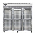 Refrigerator, reach-in display, three-section, self-contained refrigeration, stainless steel exterior & interior, standard depth, narrow hinged glass half doors, cylinder locks, electronic control with digital display, hi-low alarm, unit comes standard with electric condensate evaporator, R290 Hydrocarbon refrigerant, 1/2 HP, cETLus, NSF