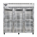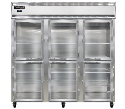 Refrigerator, 72 cu. ft. capacity, pass-thru, three-section, self-contained refrigeration, standard depth, half-height glass doors on front, half-height solid doors on rear, electronic controller with digital display, electric condensate evaporator, stainless steel exterior & interior, 5" casters, NEMA-5-15P, 1/2 HP, cETLus, NSF, Made in the USA