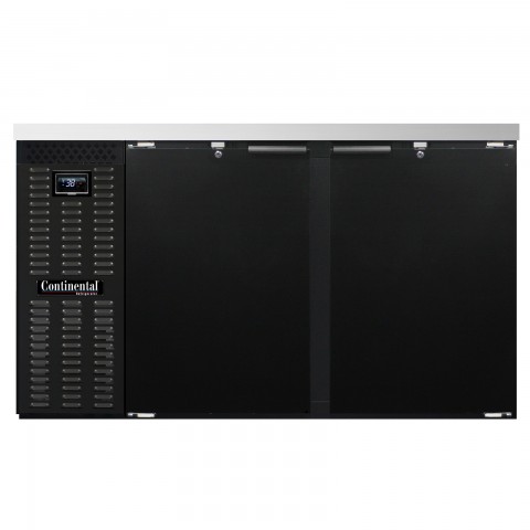 Refrigerated Back Bar Cooler, 59"W, 34-3/4"H, 22.0 cu. ft., front breathing, stainless steel top, (2) doors with locks, electronic controller with digital display & hi-low alarm, black enamel finish exterior, stainless steel interior back & side panels with reinforced stainless steel floor, epoxy coated steel shelves, self-contained refrigeration, R290 hydrocarbon refrigerant, 1/4 HP, cETLus, NSF