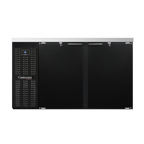 Refrigerated Back Bar Cooler, Shallow Depth, 59"W, 34-3/4"H, 15.0 cu. ft., front breathing, stainless steel top, (2) doors with locks, electronic controller with digital display & hi-low alarm, black enamel finish exterior, stainless steel interior back & side panels with reinforced stainless steel floor, epoxy coated steel shelves, self-contained refrigeration, R290 hydrocarbon refrigerant, 1/4 HP, cETLus, NSF