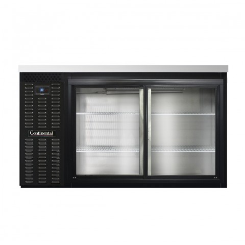 Refrigerated Back Bar Cooler, Shallow Depth, 59"W, 34-3/4"H, 15.0 cubic feet, front breathing, stainless steel top, sliding glass doors, electronic controller with digital display & hi-low alarm, black enamel finish exterior, stainless steel interior back & side panels with reinforced stainless steel floor, epoxy coated steel shelves, self-contained refrigeration, R290 hydrocarbon refrigerant, 1/4 HP, cETLus, NSF