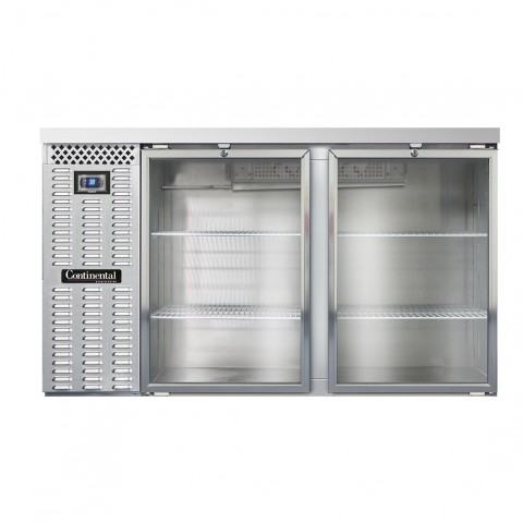 Refrigerated Back Bar Cooler, Shallow Depth, 59"W, 34-3/4"H, 15.0 cubic feet, front breathing, stainless steel top, (2) glass doors with locks, electronic controller with digital display & hi-low alarm, stainless steel exterior, stainless steel interior back & side panels with reinforced stainless steel floor, epoxy coated steel shelves, self-contained refrigeration, R290 hydrocarbon refrigerant, 1/4 HP, cETLus, NSF