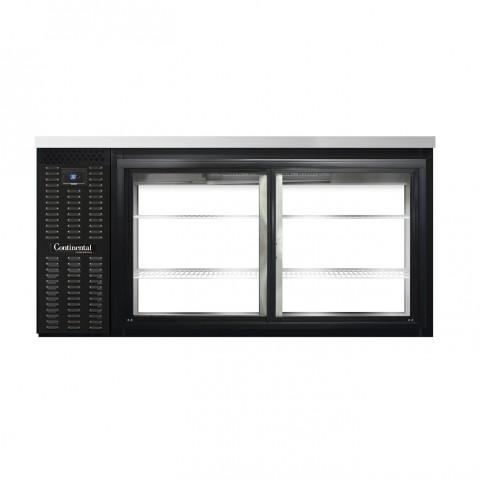 Refrigerated Back Bar Cooler, Shallow Depth, pass-thru, 69"W, 34-3/4"H, stainless steel top, 18.0 cubic feet, front breathing, sliding glass doors, electronic controller with digital display & hi-low alarm, black enamel finish exterior, stainless steel interior back & side panels with reinforced stainless steel floor, epoxy coated steel shelves, self-contained refrigeration, R290 hydrocarbon refrigerant, 1/4 HP, cETLus, NSF