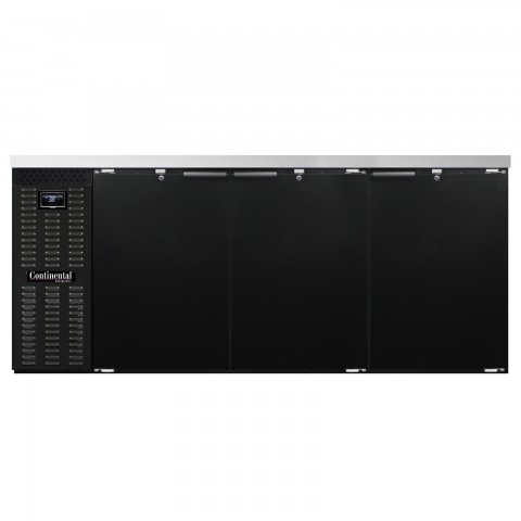 Refrigerated Back Bar Cooler, 79"W, 34-3/4"H, 28.0 cu. ft., front breathing, stainless steel top, (3) doors with locks, electronic controller with digital display & hi-low alarm, black enamel finish exterior, stainless steel interior back & side panels with reinforced stainless steel floor, epoxy coated steel shelves, self-contained refrigeration, R290 Hydrocarbon refrigerant, 1/4 HP, cETLus, NSF