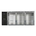 Refrigerated Back Bar Cooler, Shallow Depth, 79"W, 34-3/4"H, 22.0 cubic feet, front breathing, stainless steel top, (3) glass doors with locks, electronic controller with digital display & hi-low alarm, black enamel finish exterior, stainless steel interior back & side panels with reinforced stainless steel floor, epoxy coated steel shelves, self-contained refrigeration, R290 Hydrocarbon refrigerant, 1/4 HP, cETLus, NSF