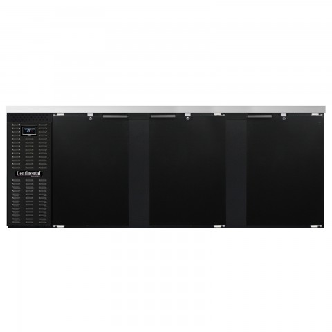 Refrigerated Back Bar Cooler, 90"W, 34-3/4"H, 35.0 cu. ft., front breathing, stainless steel top, (3) doors with locks, electronic controller with digital display & hi-low alarm, black enamel finish exterior, stainless steel interior back & side panels with reinforced stainless steel floor, epoxy coated steel shelves, self-contained refrigeration, R290 Hydrocarbon refrigerant, 1/4 HP, cETLus, NSF