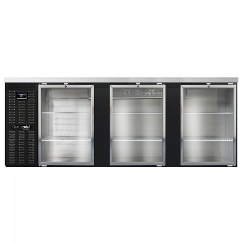 Refrigerated Back Bar Cooler, 90"W, 34-3/4"H, 35.0 cubic feet, front breathing, stainless steel top, (3) glass doors with locks, electronic controller with digital display & hi-low alarm, black enamel finish exterior, stainless steel interior back & side panels with reinforced stainless steel floor, epoxy coated steel shelves, self-contained refrigeration, R290 Hydrocarbon refrigerant, 1/4 HP, cETLus, NSF