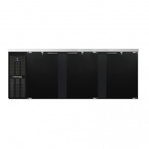 Refrigerated Back Bar Cooler, Shallow Depth, 90"W, 34-3/4"H, 25.0 cu. ft., front breathing, stainless steel top, (3) doors with locks, 23" shallow depth, electronic controller with digital display & hi-low alarm, black enamel finish exterior, stainless steel interior back & side panels with reinforced stainless steel floor, epoxy coated steel shelves, self-contained refrigeration, R290 Hydrocarbon refrigerant, 1/4 HP, cETLus, NSF