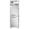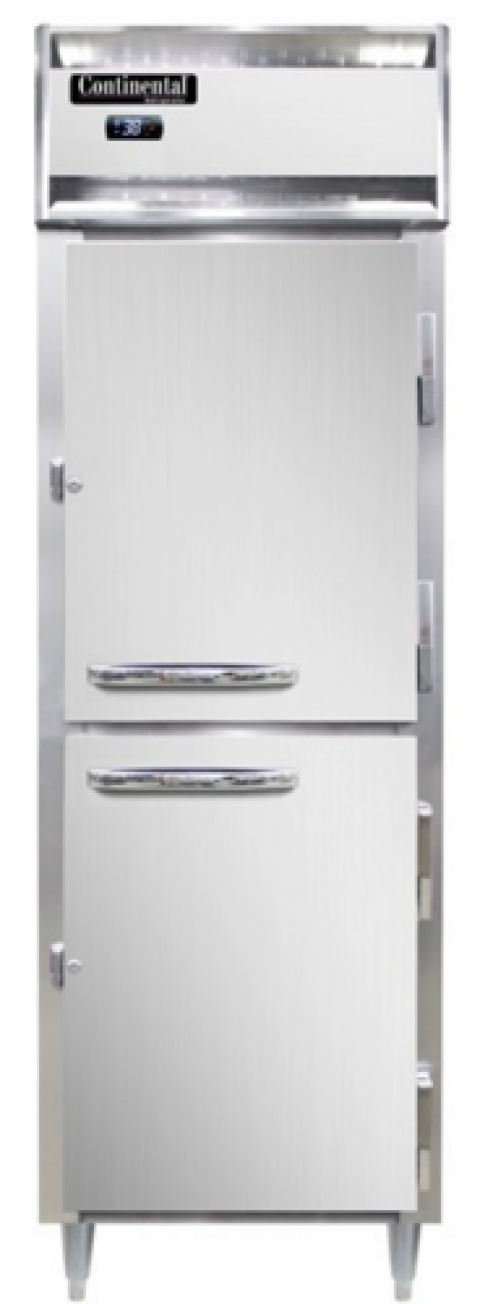Designer Line Refrigerator, 21 cu. ft. capacity, pass-thru, one-section, self-contained refrigeration, standard depth cabinet, electronic controller with digital display half -height solid doors on front, half-height glass doors on rear, stainless steel exterior, aluminum interior, 6" stainless steel legs, NEMA-5-15P, 1/4 HP, cETLus, NSF, Made in the USA