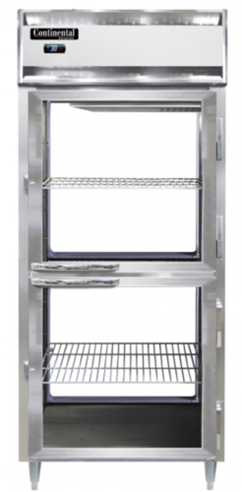 Designer Line Extra-Wide Refrigerator, 32 cu. ft. capacity, pass-thru, 36-1/4" wide one-section, self-contained refrigeration, standard depth cabinet, electronic controller with digital display, wide half-height glass doors on front and rear, stainless steel exterior, aluminum interior, 6" adjustable stainless steel legs, NEMA-5-15P, 1/3 HP, cETLus, NSF, Made in the USA