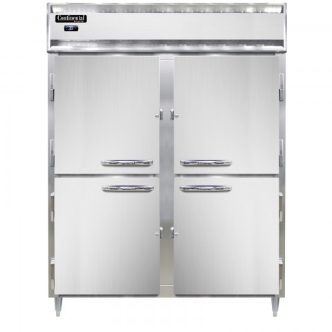 Designer Line Wide Refrigerator, pass-thru, 57"W, two-section, self-contained refrigeration, stainless steel exterior, aluminum interior, standard depth cabinet, wide half-height stainless steel doors, cylinder locks, electronic control with digital display, hi-low alarm, 6" stainless steel legs, R290 hydrocarbon refrigerant, 1/3 HP, ENERGY STAR®