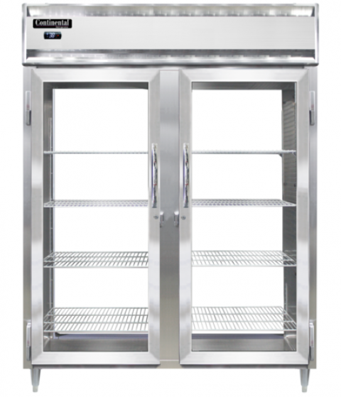 Designer Line Wide Refrigerator, 52 cu. ft. capacity, pass-thru, 57" wide two-section, self-contained refrigeration, standard depth cabinet, electronic controller with digital display, wide full-height glass doors on front and rear, stainless steel exterior & interior, 6" stainless steel legs, NEMA-5-15P, 1/2 HP, cETLus, NSF, Made in the USA