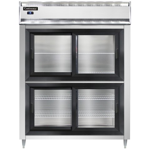 Designer Line Wide Refrigerator, reach-in, 57"W, two-section, self-contained refrigeration, stainless steel exterior, aluminum interior, shallow depth cabinet, wide half-height sliding glass doors, cylinder locks, electronic control with digital display, hi-low alarm, 6" stainless steel legs, R290 Hydrocarbon refrigerant, 1/3 HP, cETLus, NSF