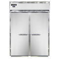 Designer Line Refrigerator, 64 cu. ft. capacity, roll-thru, two-section, self-contained refrigeration, standard depth cabinet, full-height stainless steel doors on front, full-height glass doors on rear, electronic controller with digital display, removable stainless steel ramps, stainless steel exterior, aluminum interior, NEMA-5-15P, 1/2 HP, cETLus, NSF, Made in the USA