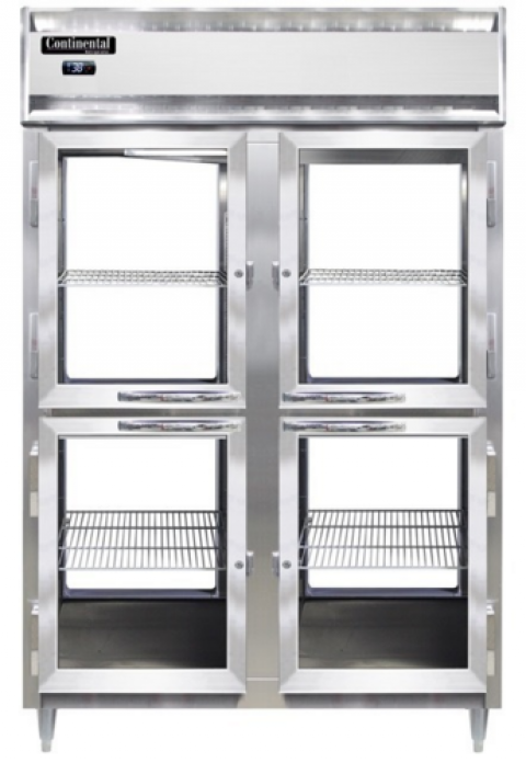 Designer Line Refrigerator, 50 cu. ft. capacity, pass-thru, two-section, self-contained refrigeration, standard depth cabinet, electronic controller with digital display, half-height glass doors on front and rear, stainless steel exterior, aluminum interior, stainless steel front, 6" stainless steel legs, NEMA-5-15P, 1/2 HP, cETLus, NSF, Made in the USA
