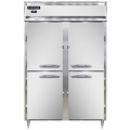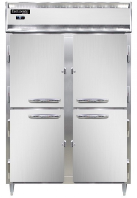 Designer Line Refrigerator, 50 cu. ft. capacity, pass-thru, two-section, self-contained refrigeration, standard depth cabinet, electronic controller with digital display, half-height stainless steel doors on front, half-height glass doors on rear, stainless steel exterior, aluminum interior, 6" stainless steel legs, NEMA-5-15P, 1/2 HP, cETLus, NSF, Made in the USA