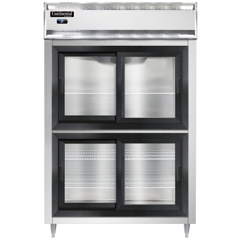 Designer Line Refrigerator, reach-in, two-section, self-contained refrigeration, aluminum exterior & interior, stainless steel front, shallow depth cabinet, half-height sliding glass doors, cylinder locks, electronic control with digital display, hi-low alarm, 6" stainless steel legs, R290 Hydrocarbon refrigerant, 1/3 HP, cETLus, NSF
