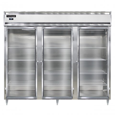 Designer Line Wide Refrigerator, reach-in, 85-1/5"W, three-section, self-contained refrigeration, aluminum exterior & interior, stainless steel front, standard depth cabinet, wide full-height glass doors, cylinder locks, electronic control with digital display, hi-low alarm, 6" stainless steel legs, R290 Hydrocarbon refrigerant, 1/2 HP, cETLus, NSF