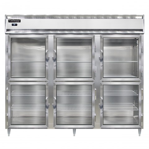 Designer Line Wide Refrigerator, reach-in, 85-1/5"W, three-section, self-contained refrigeration, aluminum exterior & interior, stainless steel front, standard depth cabinet, wide half-height glass doors, cylinder locks, electronic control with digital display, hi-low alarm, 6" stainless steel legs, R290 Hydrocarbon refrigerant, 1/2 HP, cETLus, NSF