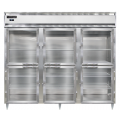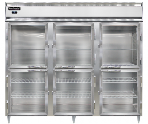 Designer Line Wide Refrigerator, 75 cu. ft. capacity, pass-thru, 85-1/5" wide three-section, self-contained refrigeration, standard depth cabinet, electronic controller with digital display, wide half-height glass doors on front, wide half-height stainless steel doors on rear, aluminum exterior & interior, stainless steel front, 6" stainless steel legs, NEMA-5-15P, 1/2 HP, cETLus, NSF, Made in the USA