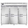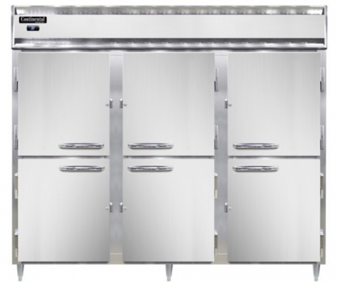 Designer Line Wide Refrigerator, 75 cu. ft. capacity, pass-thru, 85-1/5" wide three-section, self-contained refrigeration, standard depth cabinet, electronic controller with digital display, wide half-height stainless steel doors on front, wide half-height glass doors on rear, aluminum exterior & interior, stainless steel front, 6" stainless steel legs, NEMA-5-15P, 1/2 HP, cETLus, NSF, Made in the USA
