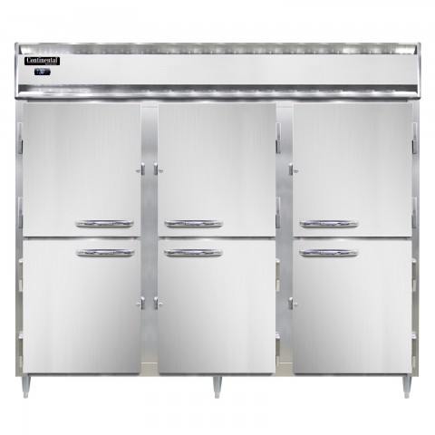 Designer Line Wide Refrigerator, reach-in, 85-1/5"W, three-section, self-contained refrigeration, stainless steel exterior, aluminum interior, standard depth cabinet, wide half-height stainless steel doors, cylinder locks, electronic control with digital display, hi-low alarm, 6" stainless steel legs, R290 Hydrocarbon refrigerant, 1/2 HP, cETLus, NSF