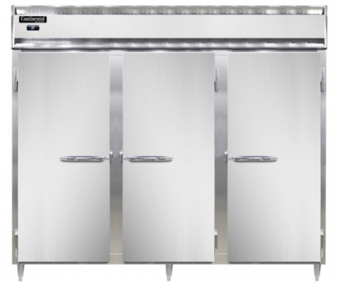 Designer Line Wide Refrigerator, 75 cubic ft. capacity, pass-thru, 85-1/5" wide three-section, self-contained refrigeration, stainless steel exterior & interior, standard depth cabinet, wide full-height stainless steel doors on front, wide full-height glass doors on rear, 6" stainless steel legs, electronic controller w/ digital display, NEMA-5-15P, 1/2 HP, cETLus, NSF, Made in the USA