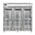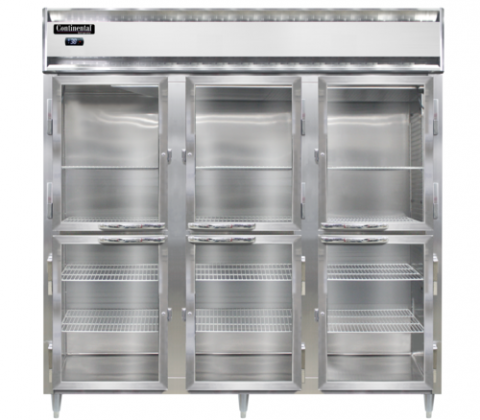 Designer Line Refrigerator, 72 cubic ft. capacity, pass-thru, three-section, self-contained refrigeration, stainless steel exterior, aluminum interior, standard depth cabinet, half-height glass doors on front, half-height stainless steel doors on rear, 6" stainless steel legs, electronic controller w/ digital display, NEMA-5-15P, 1/2 HP, cETLus, NSF, Made in the USA