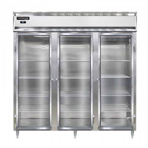 Designer Line Refrigerator, reach-in, three-section, self-contained refrigeration, stainless steel exterior & interior, standard depth cabinet, full-height glass doors, cylinder locks, electronic control with digital display, hi-low alarm, 6" stainless steel legs, R290 Hydrocarbon refrigerant, 1/2 HP, cETLus, NSF
