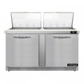 Designer Line Mighty Top Sandwich Unit, Front Breather, 60"W, two-section, (24) 1/6 size x 4" deep pans with 8" cutting board, (2) field rehingeable doors, stainless steel top, front, sides & interior, electronic control with digital display, hi-low alarm, 3-3/4" casters, rear mounted self-contained refrigeration, automatic hot gas condensate evaporator, R290 hydrocarbon refrigerant, 1/3 HP, cETLus, NSF