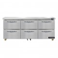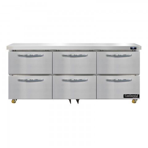 Designer Line Undercounter Refrigerator, 72"W, three-section, (6) drawers, accommodates (1) 12 x 18 x 6 pan per drawer or (1) 1/2 x 6 pan & (1) 1/3 x 6 pans per drawer capacity (supplied by others), stainless steel exterior & interior, stainless steel top, 1-3/8" diameter plate casters, front breathing, electronic control with digital display, hi-low alarm, rear mounted self-contained refrigeration, R290 hydrocarbon refrigerant, 1/5 HP, cETLus, NSF