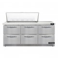Designer Line Mighty Top Sandwich Unit, Front Breather, 72"W, three-section, (18) 1/6 size x 4" deep pans with 8" cutting board, (6) drawers, accommodates (1) 12 x 18 x 6 pan per drawer or (1) 1/2 x 6 pan & (1) 1/3 x 6 pans per drawer capacity (supplied by others), stainless steel top, front, sides & interior, electronic control with digital display, hi-low alarm, 3-3/4" casters, rear mounted self-contained refrigeration, automatic hot gas condensate evaporator, R290 hydrocarbon refrigerant, 1/3 HP, cETLus, NSF