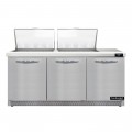Designer Line Mighty Top Sandwich Unit, Front Breather, 72"W, three-section, (24) 1/6 size x 4" deep pans with 8" cutting board, (3) field rehingeable doors, stainless steel top, front, sides & interior, electronic control with digital display, hi-low alarm, 3-3/4" casters, rear mounted self-contained refrigeration, automatic hot gas condensate evaporator, R290 hydrocarbon refrigerant, 1/3 HP, cETLus, NSF