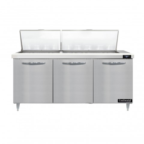 Designer Line Mighty Top Sandwich Unit, 72"W, three-section, (27) 1/6 size x 4" deep pans with 8" cutting board, (3) field rehingeable doors, stainless steel top, front, sides & interior, electronic control with digital display, hi-low alarm, 6" adjustable legs, rear mounted self-contained refrigeration, automatic hot gas condensate evaporator, R290 hydrocarbon refrigerant, 1/3 HP, cETLus, NSF