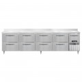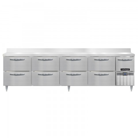 Designer Line Refrigerated Base Worktop Unit, 118"W, reinforced stainless steel work top with 6"H backsplash, stainless steel exterior, front, sides & interior, (8) drawers & (1) half height field rehingeable door, 6" adjustable stainless steel legs, electronic control, off-cycle defrost, R290 hydrocarbon refrigerant, 1/4 HP, side-mounted refrigeration, cETLus, NSF