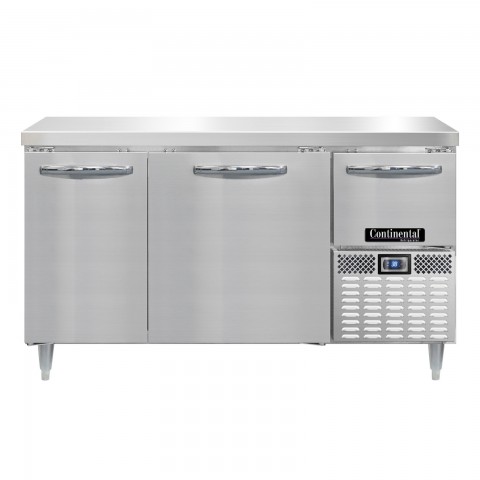 Designer Line Refrigerated Base Worktop Unit, 60"W, reinforced stainless steel work top, stainless steel exterior, front, sides & interior, (2) full & (1) half height field rehingeable doors, 6" adjustable stainless steel legs, electronic control, off-cycle defrost, 1/4 HP, side-mounted refrigeration, R290 hydrocarbon refrigerant, cETLus, NSF, ENERGY STAR®