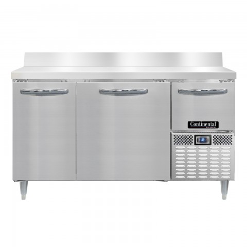 Designer Line Refrigerated Base Worktop Unit, 60"W, reinforced stainless steel work top with 6"H backsplash, stainless steel exterior, front, sides & interior, (2) full & (1) half height field rehingeable doors, 6" adjustable stainless steel legs, electronic control, off-cycle defrost, 1/4 HP, side-mounted refrigeration, R290 hydrocarbon refrigerant, cETLus, NSF, ENERGY STAR®