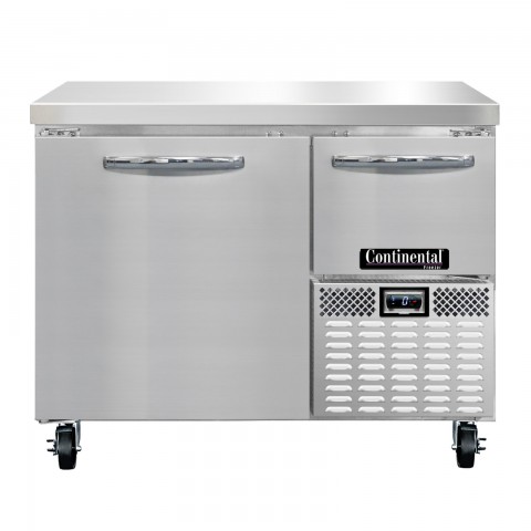 Freezer Base Worktop Unit, 43"W, 300 series stainless steel flat work top, stainless steel front & end panels, galvanized steel rear & grill, aluminum interior, (1) full & (1) half height field rehingeable doors, electronic control, off-cycle defrost, 1/3 HP, R290 hydrocarbon refrigerant, side-mounted refrigeration, cETLus, NSF