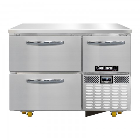 Undercounter Freezer Base, 43"W, stainless steel front & end panels, stainless steel top, aluminum interior, (2) drawers & (1) half height field rehingeable door, electronic control, off-cycle defrost, (8) 1-3/8" diameter plate casters mounted on heavy-duty support plates (easily field installed), 1/3 HP, R290 hydrocarbon refrigerant, front breathing, side-mounted refrigeration, cETLus, NSF