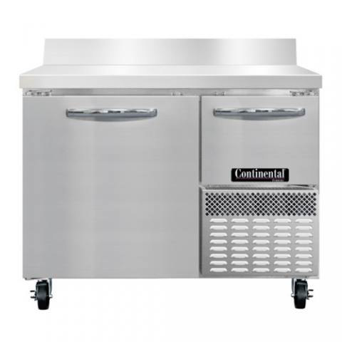 Freezer Base Shallow Depth Worktop Unit, 43"W, 300 series stainless steel work top with 6"H backsplash, stainless steel front & end panels, galvanized steel rear & grill, aluminum interior, (1) full & (1) half height field rehingeable doors,electronic control, off-cycle defrost, 1/3 HP, R290 hydrocarbon refrigerant, side-mounted refrigeration, cETLus, NSF