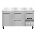 Freezer Base Shallow Depth Worktop Unit, 60"W, 300 series stainless steel work top with 6"H backsplash, stainless steel front & end panels, galvanized steel rear & grill, aluminum interior, (2) drawers hold (1) 12 x 20 x 6 pans per drawer (supplied by others), (2) narrow drawers hold (4) 6 x 6 2/3 x 6 pan per drawer (supplied by others) & (1) half height field rehingeable door, electronic control, off-cycle defrost, 1/2 HP, R290 hydrocarbon refrigerant, side-mounted refrigeration, cETLus, CE, NSF