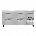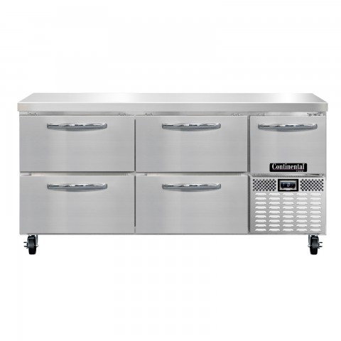 Freezer Base Worktop Unit, 68"W, 300 series stainless steel flat work top, stainless steel front & end panels, galvanized steel rear & grill, aluminum interior, (4) drawers hold (2) 12 x 20 x 6 pans per drawer (supplied by others), (1) half height field rehingeable door, electronic control, off-cycle defrost, 1/2 HP, R290 hydrocarbon refrigerant, side-mounted refrigeration, cETLus, NSF