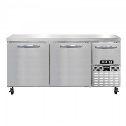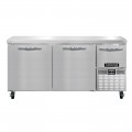 Freezer Base Worktop Unit, 68"W, 300 series stainless steel flat work top, stainless steel front & end panels, galvanized steel rear & grill, aluminum interior, (2) full & (1) half height field rehingeable doors, electronic control, off-cycle defrost, 1/2 HP, R290 hydrocarbon refrigerant, side-mounted refrigeration, cETLus, NSF