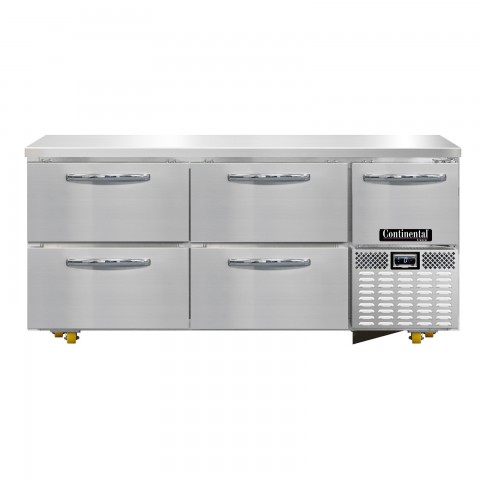 Undercounter Freezer Base, 68"W, stainless steel front & end panels, stainless steel top, aluminum interior, (4) drawers & (1) half height field rehingeable door, electronic control, off-cycle defrost, unit comes standard with expansion valve, (8) 1-3/8" diameter plate casters mounted on heavy-duty support plates (easily field installed), 1/2 HP, R290 hydrocarbon refrigerant, front breathing, side-mounted refrigeration, cETLus, NSF