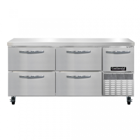 Freezer Base Shallow Depth Worktop Unit, 68"W, 300 series stainless steel flat work top, stainless steel front & end panels, galvanized steel rear & grill, aluminum interior, (4) drawers hold (1) 12 x 20 x 6 pans per drawer (supplied by others), (1) half height field rehingeable door, electronic control, off-cycle defrost, 1/2 HP, R290 hydrocarbon refrigerant, side-mounted refrigeration, cETLus, NSF