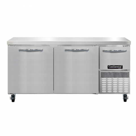 Freezer Base Shallow Depth Worktop Unit, 68"W, 300 series stainless steel flat work top, stainless steel front & end panels, galvanized steel rear & grill, aluminum interior, (2) full & (1) half height field rehingeable doors, electronic control, off-cycle defrost, 1/2 HP, R290 hydrocarbon refrigerant, side-mounted refrigeration, cETLus, NSF