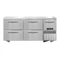 Undercounter Shallow Depth Freezer Base, 68"W, stainless steel front & end panels, stainless steel top, aluminum interior, (4) drawers hold (1) 12 x 20 x 6 pans per drawer (supplied by others) & (1) half height field rehingeable door, electronic control, off-cycle defrost, unit comes standard with expansion valve, (8) 1-3/8" diameter plate casters mounted on heavy-duty support plates (easily field installed), 1/2 HP, R290 hydrocarbon refrigerant, front breathing, side-mounted refrigeration, cETLus, NSF