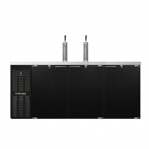 Keg Cooler, 79"W, 22.0 cu. ft., front breathing, (3) barrel or straight wall keg capacity, stainless steel top with (2) columns & drainer, 23" shallow depth, (3) doors with locks, electronic controller with digital display & hi-low alarm, black enamel finish exterior, stainless steel interior back & side panels with reinforced stainless steel floor, self-contained refrigeration, R290 Hydrocarbon refrigerant, 1/4 HP, cETLus, NSF