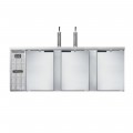 Keg Cooler, 90"W, 25.0 cu. ft., front breathing, (4) barrel or straight wall keg capacity, stainless steel top with (2) columns & drainer, 23" shallow depth, (3) doors with locks, electronic controller with digital display & hi-low alarm, stainless steel exterior, stainless steel interior back & side panels with reinforced stainless steel floor, self-contained refrigeration, R290 Hydrocarbon refrigerant, 1/4 HP, cETLus, NSF