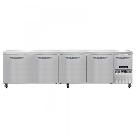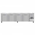 Refrigerated Base Worktop Unit, 118"W, 300 series stainless steel flat work top, stainless steel front & end panels, galvanized steel rear & grill, aluminum interior, (4) full & (1) half height field rehingeable doors, electronic control, off cycle defrost, R290 Hydrocarbon refrigerant, 1/4 HP, side-mounted refrigeration, cETLus, NSF, ENERGY STAR®